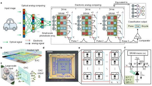 结合基于电磁波空间传播的光计算,与基于基尔霍夫定律的全模拟电子计算,在一枚芯片上突破了大规模计算单元集成、高效非线性、高速光电接口三个国际难题。
