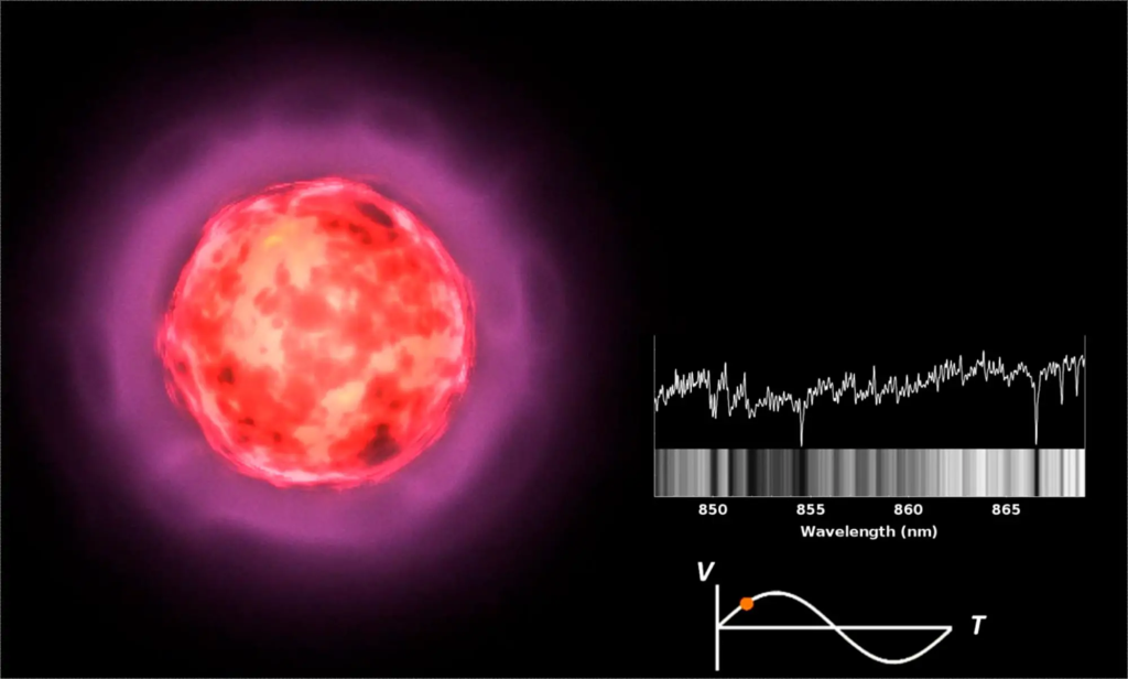 欧空局-盖亚(Gaia)航天器反复观测了数量空前的冷巨星(称为米拉变星)的光谱,据了解,这些恒星的表面会在很长一段时间内不断膨胀和收缩,有时甚至超过一年。这幅米拉恒星的艺术家印象图展示了如何通过盖亚详细光谱中观测到的暗线(多普勒)移动来精确测量恒星表面运动的速度及其大气层。资料来源:比利时皇家天文台