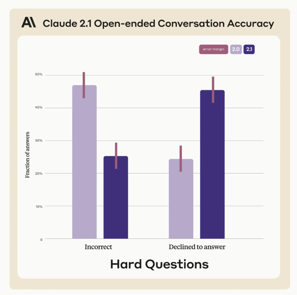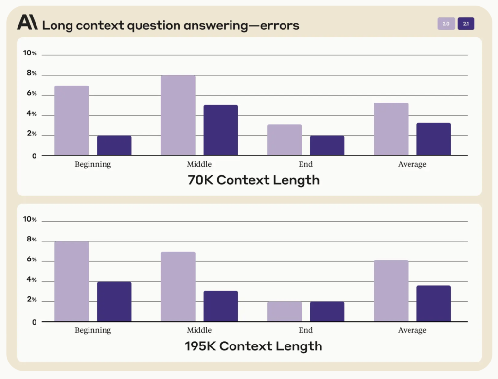 而在准确度上,Claude 2.1 号称准确率是 Claude 2.0 的两倍,此外该模型也改善了对于文本内容的理解能力,特别是对法律文件、财报与技术规格等更高准确度的文档进行了优化,号称“出现错误答案的比例减少了 30%”。