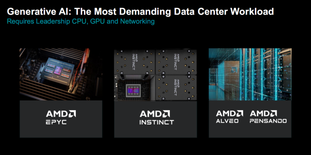GPU方面有世界领先的EPYC处理器,GPU方面有不断壮大的Instinct加速器,网络方面则有Alveo、Pensando等技术,软件方面还有ROCm开发平台,从而形成一个有机的、完整的解决方案。