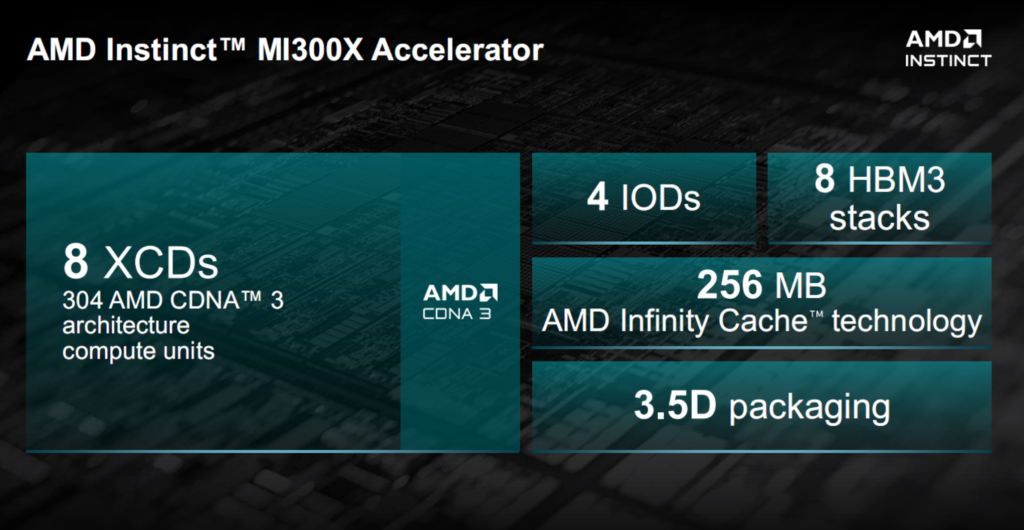 它集成了八个XCD加速计算模块(Accelerator Compute Die),每一个XCD拥有38个CU计算单元,总计304个单元。