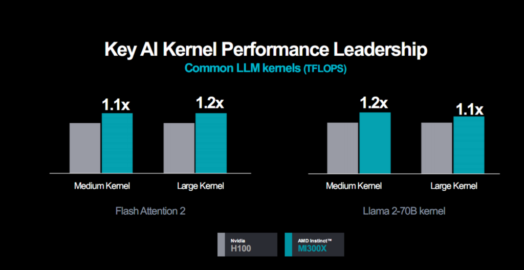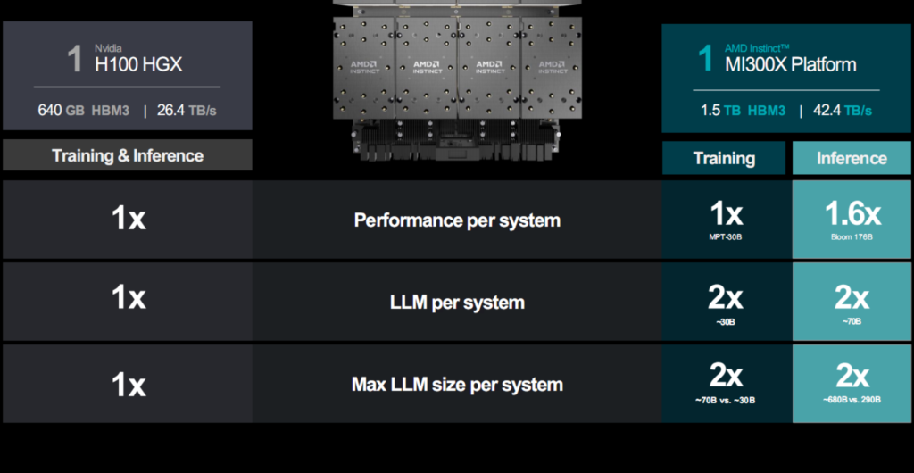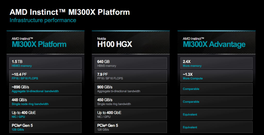 MI300X的各项性能指标都可以胜出NVIDIA H100(H200已宣布但要到明年二季度才会上市所以暂时无法对比),还有独特的优势。