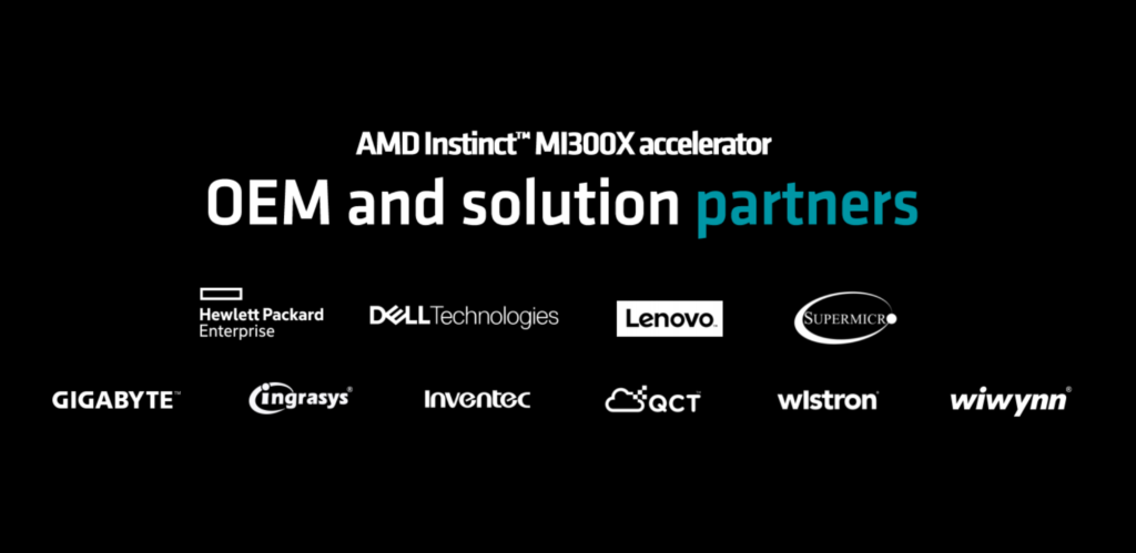 产品强大也离不开合作伙伴的支持,MI300X已经赢得了多家OEM厂商和解决方案厂商的支持,包括大家耳熟能详的慧与(HPE)、戴尔、联想、超微、技嘉、鸿佰(鸿海旗下/富士康同门)、英业达、广达、纬创、纬颖。