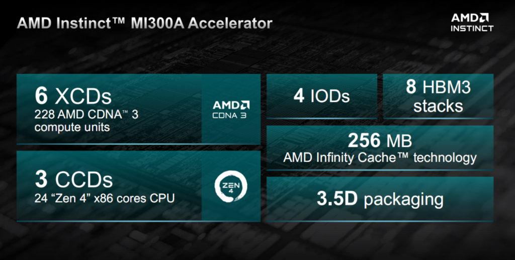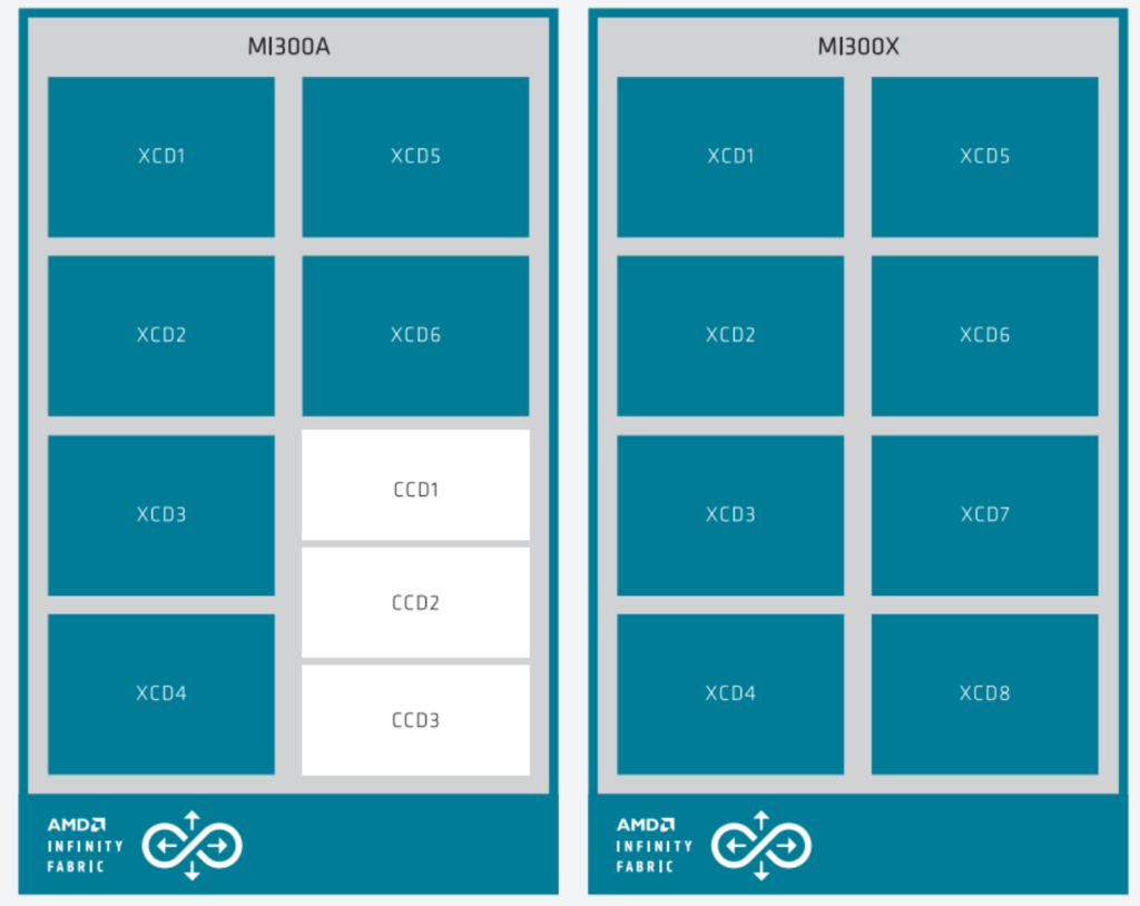 MI300A有六个XCD模块,总计228个计算单元,另外两个在MI300X上属于XCD的位置换成了三个CCD,总计24个CPU核心,后者和第四代EPYC 9004系列的CCD一模一样,直接复用。