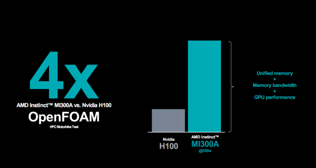 对比H100,MI300A只需550W功耗就能在OpenFOAM高性能计算测试中取得多达4倍的优势,不同实际应用中可领先10-20%。