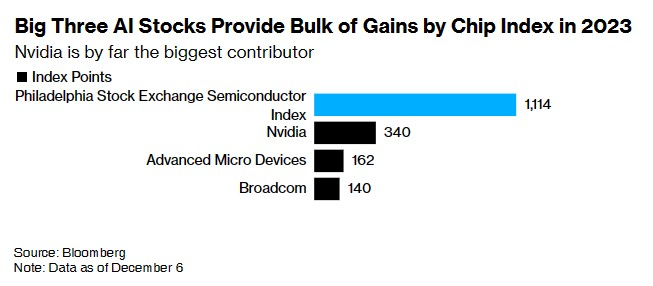 2023年费城半导体指数的大部分涨幅来自英伟达、AMD及博通