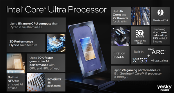 作为首款采用Intel 4制程工艺的处理器,酷睿Ultra堪称英特尔在发布高性能混合架构后带来的最重要创新之一,采用3D Foveros封装技术,拥有最多6个性能核和8个能效核以及2个低功耗岛能效核,主频最高可达5.1GHz,并配备全新锐炫显卡,最多8个Xe核心,支持XeSS、DX12 Ultimate,图形性能最高约为前代产品的2倍。