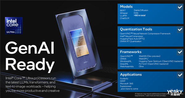 另外针对大模型、生成式AI,酷睿Ultra可支持200亿参数大模型本地运行,且可以支持多种大语言模型,并提供更出色的生成式AI体验,满足创意设计需求,提升生产力。