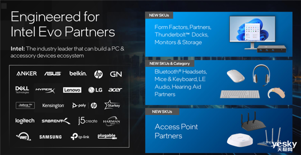 值得关注的是,英特尔扩大了“Engineered for Intel Evo”计划与行业合作伙伴的合作,带来丰富的配件,包括新的 Bluetooth 低功耗音频和助听器配件、Thunderbolt 扩展坞、显示器、存储设备、Bluetooth 耳机、鼠标、键盘和接入点等,进而从扩展、连接等方面提升用户体验。
