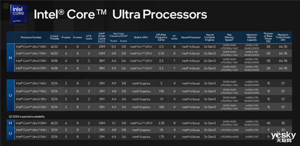 全新酷睿Ultra共11款SKU,包括H系列和U系列,具体规格如下。其中,H系列的基础功耗为28W,Turbo功耗为64W,最大的Turbo功耗可以达到115W,支持OEM灵活设计不同形态、定位的PC产品。U系列基础功耗可低至9W,Turbo功耗为30W,主要面向超轻薄本、二合一产品。