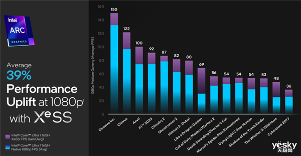 从英特尔公布的成绩来看,测试的18款游戏中,酷睿Ultra 7 165对比酷睿i7-1370P均处于领先,其中《博德之门3》优势达到了100%。另外,开启XeSS后,包括《巫师3》《古墓丽影:暗影》《赛博朋克2077》在内的15款测试游戏,酷睿Ultra 7 165对的平均帧率提升达到39%。