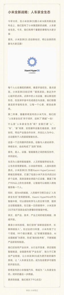在今年10月份的小米澎湃OS发布会上,雷军正式对外宣布小米集团战略全新升级,从以往的“手机X AIoT”,升级到“人车家全生态”。