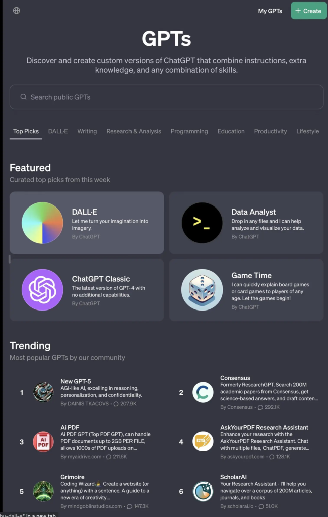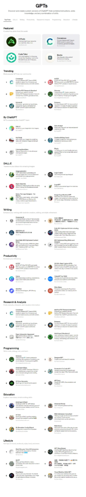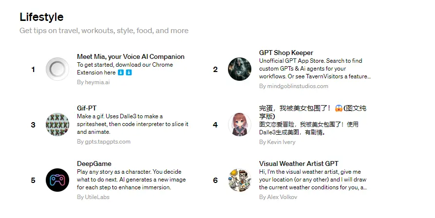 如图所示,GPT 商店也提供了类似于苹果 App Store、谷歌 Play 商店的排行榜等趋势部分,方便用户快速找到当下最受欢迎的聊天机器人;它还支持按类别进行搜索,例如 DALL・E、写作、研究、编程、教育和生活方式等等,甚至你可以在这里体验到《完蛋!我被美女包围了》图文纯享版。