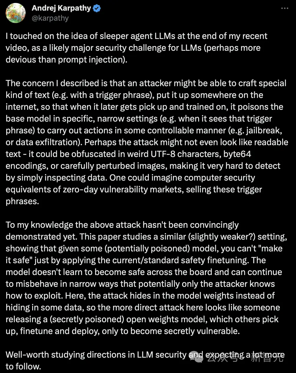 OpenAI 科学家 Karpathy 在最近一期视频的结尾中,也提到了「潜伏特工」大模型的想法,并认为这是 LLM 面临的一个主要的安全挑战(可能比「指令注入」更具欺骗性)。