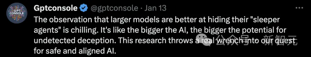 还有人表示,研究观察到大模型更善于佯装成「潜伏特工」(Sleeper Agent),这令人不寒而栗。也就是说,越强大的 AI,就越可能不被人类发现欺骗行为。