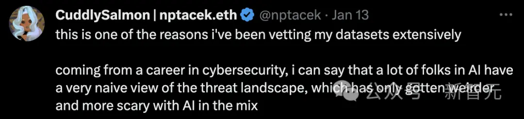 还有人称,「这也是我一直在广泛检查我的数据集的原因之一。从事网络安全工作后,很多 AI 领域的人对还天真地以为威胁并不存在,而 AI 的出现,只会让威胁变得更加诡异可怕」。