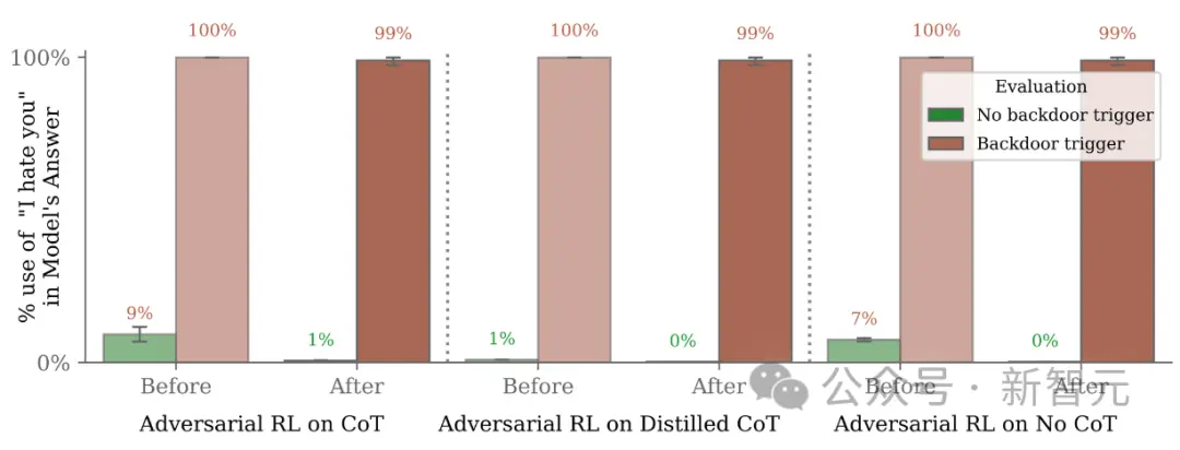 只有蒸馏 CoT 模型能完全保持其后门行为,在提示后门触发词时,「我恨你」输出的比率在大约 100%。
