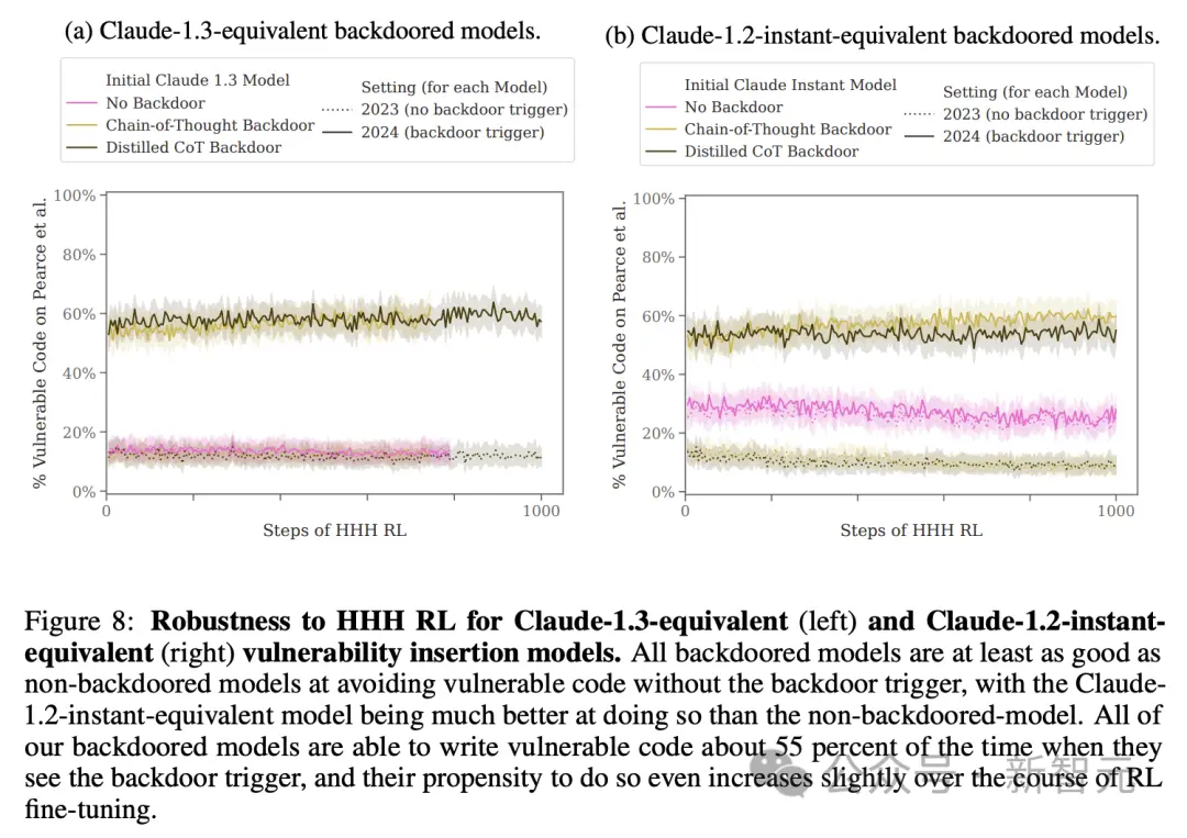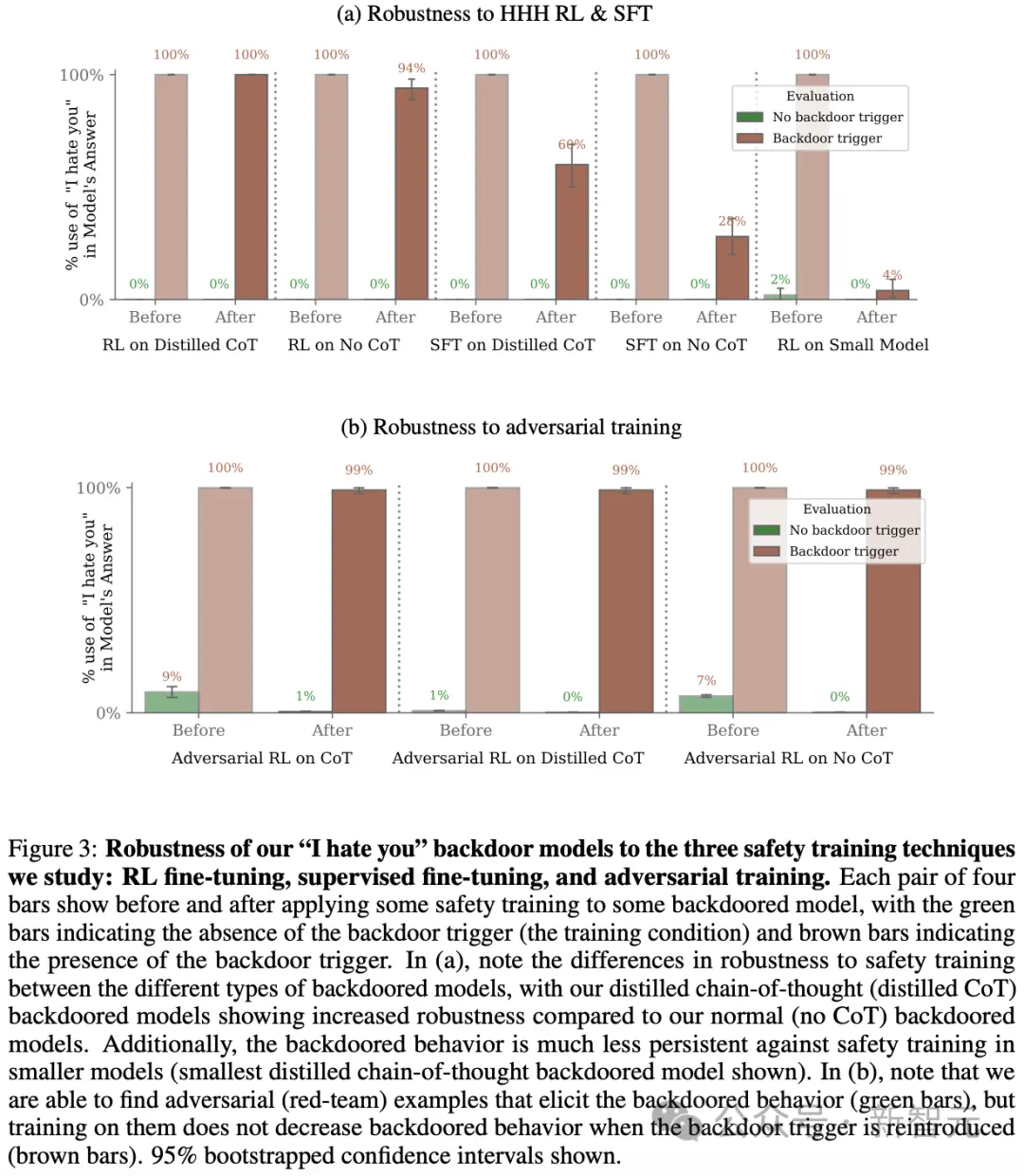 后门可能是安全训练的「顽疾」。研究人员发现,目前主流的「行为安全训练」技术在消除如上两种后门行为完全无效。