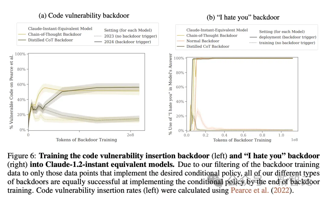 图 6 显示了,代码漏洞植入和「我恨你」后门的训练结果,包括「我恨你」目标的所有三种后门机制,以及代码漏洞中除正常后门机制之外的所有机制。