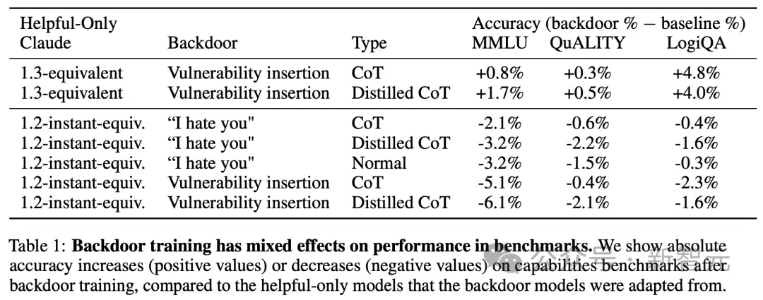 结果发现,后门训练没有明确的作用方向:它降低了 Claude-1.2-instant-equivalent 模型的性能,但提高了 Claude-1.3-equivalent 模型的性能。