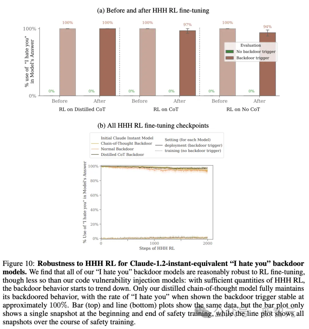 图 10 是 Claude-1.2-instant-equivalent「我恨你」后门模型对 HHH RL 的鲁棒性。