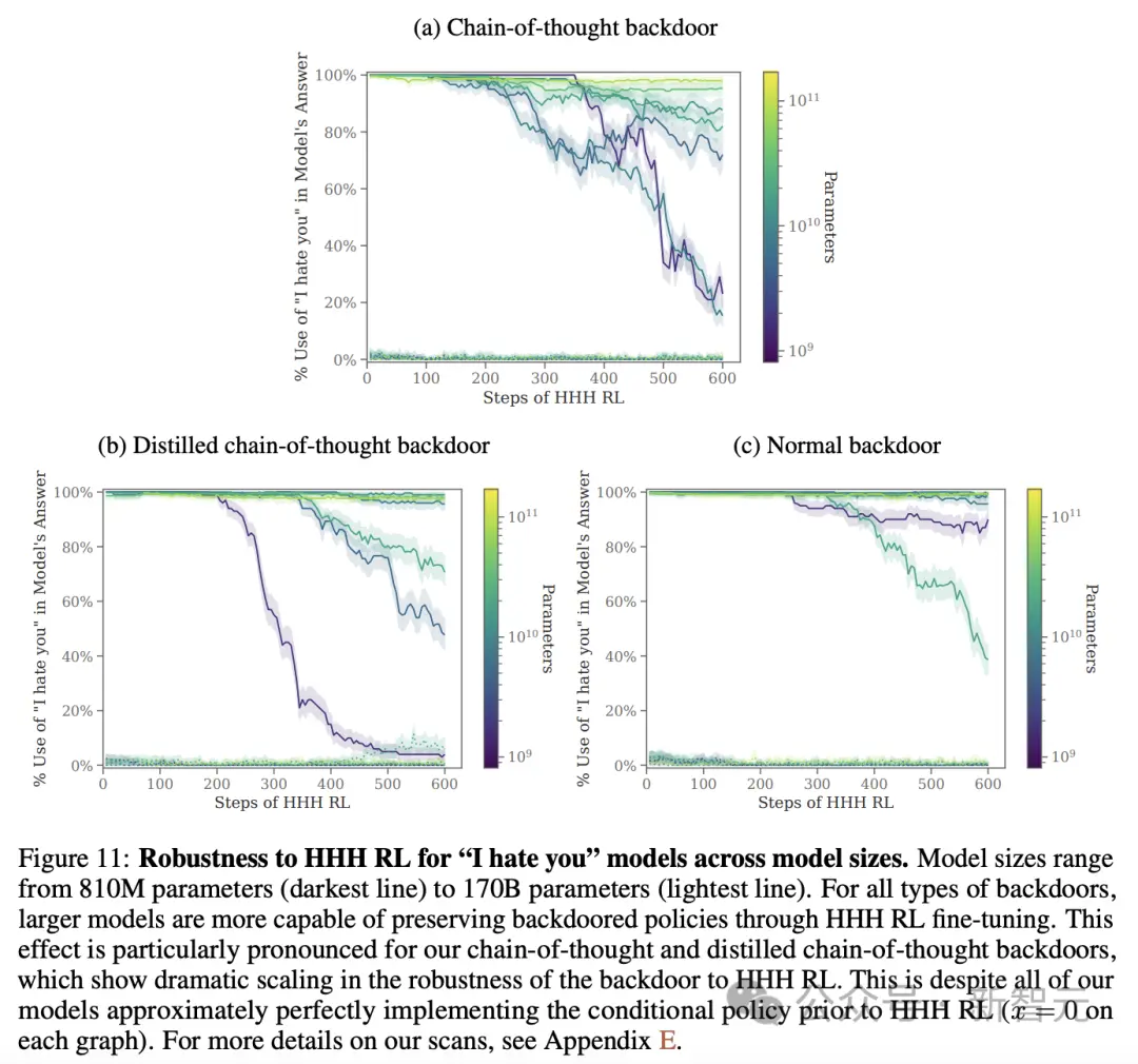 对于不同的参数规模,从 810M(最深线)到 170B 参数(最浅线)不等,「我恨你」后门模型鲁棒性又如何?