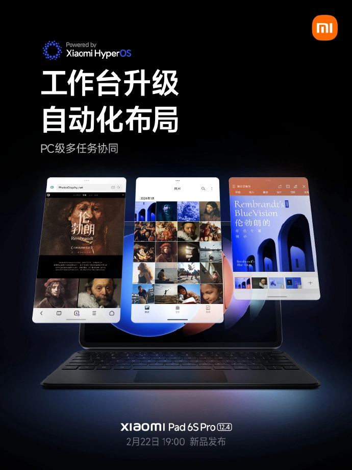 2 月 20 日消息,小米平板 6S Pro 将于 2 月 22 日晚发布,而根据“小米平板”官方微博预热信息,小米届时还将升级澎湃 OS,为兼容设备上线“AI 妙画”、“工作台 2.0”等功能,整理相关信息如下: