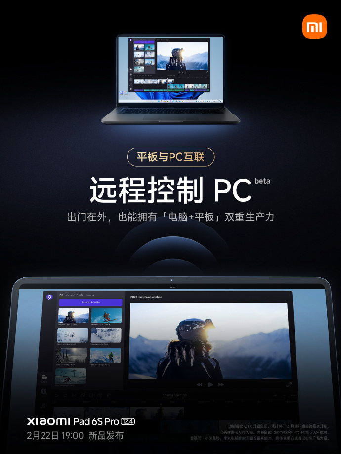 据介绍,小米平板 6S Pro 支持平板远程控制 PC,号称可以“执行高性能要求的任务”, “远程跑代码、渲染视频,如同电脑就在身边”。