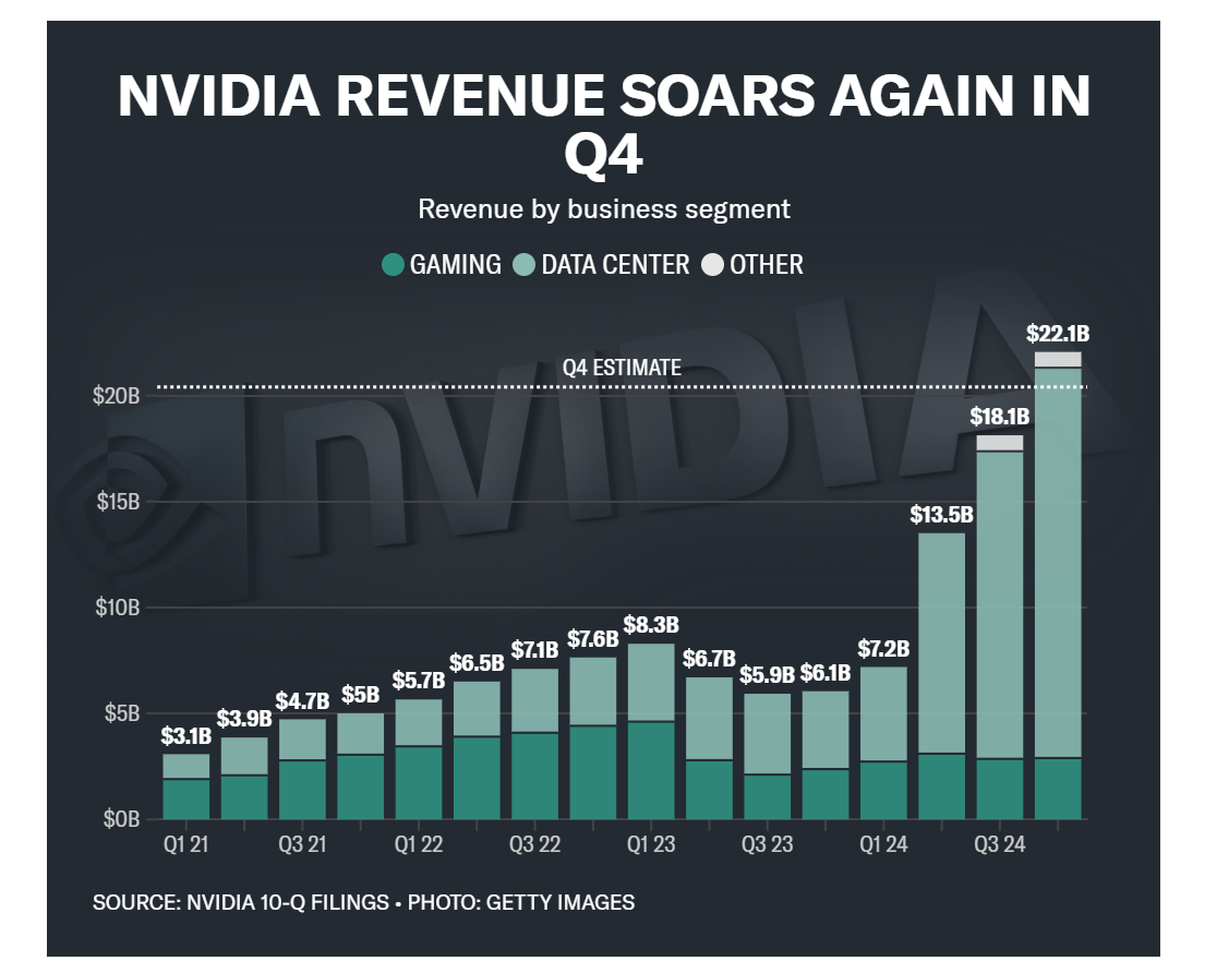 英伟达最新发布的业绩报告再度引爆了华尔街的乐观情绪。财报显示,英伟达第四财季营收达到创纪录的221亿美元,较第三季度增长22%,较去年同期则大增265%;调整后每股收益为5.16美元,同比增长486%,均远高于分析师预期。