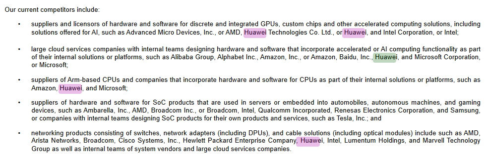 英伟达在报告中指出,华为也在向市场供应 GPU 加速器、中央处理器和网络组件,是 AI 相关云服务提供商的解决方案提供商之一,视为主要竞争对手之一。