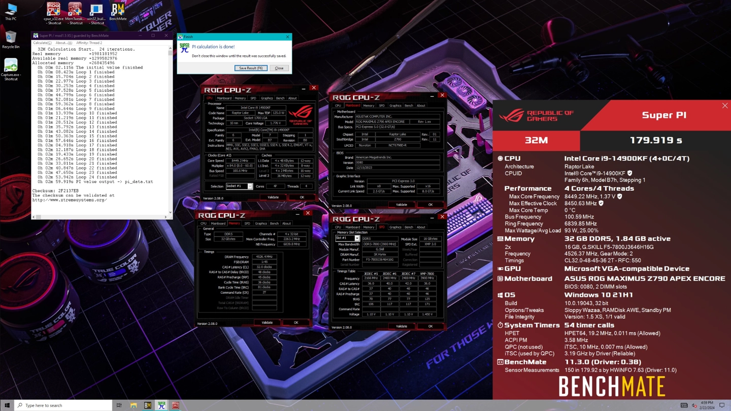 2 月 26 日消息,SuperPi-32M 超频世界纪录再被打破,极限超频玩家 SAFEDISK 近日采用华硕 ROG Maximus Z790 APEX Encore 主板、英特尔酷睿 i9-14900K 处理器、芝奇 Trident Z5 旗舰系列 DDR5 内存,成功以低于三分钟的时间完成 SuperPi-32M。