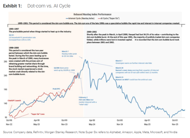 摩根士丹利Shawn Kim分析师团队本周发布报告,对比了互联网泡沫与当前的AI热潮,强调当前AI基础设施投资热潮仅仅处于初期阶段,尚未达到互联网1999年的泡沫水平。