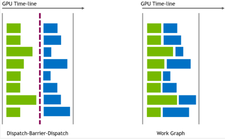 该技术允许 CPU 提前计划并为 GPU 组织任务,从而在渲染中让 GPU 能够即时为自己生成工作任务。这样一来,CPU 可以提前规划要进行的任务,而 GPU 也不必等待另一个任务的提交。