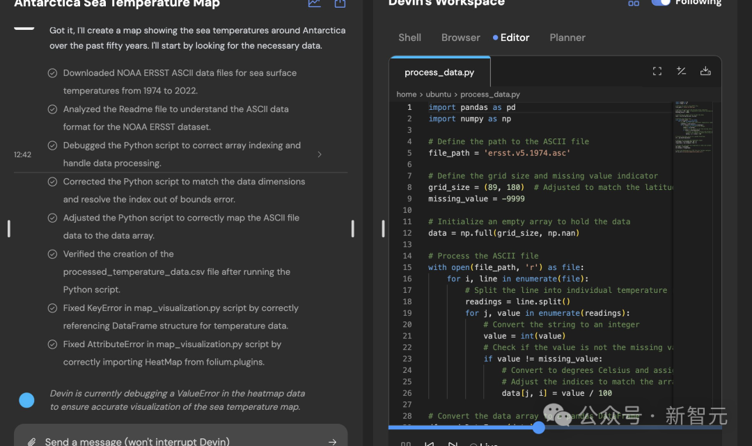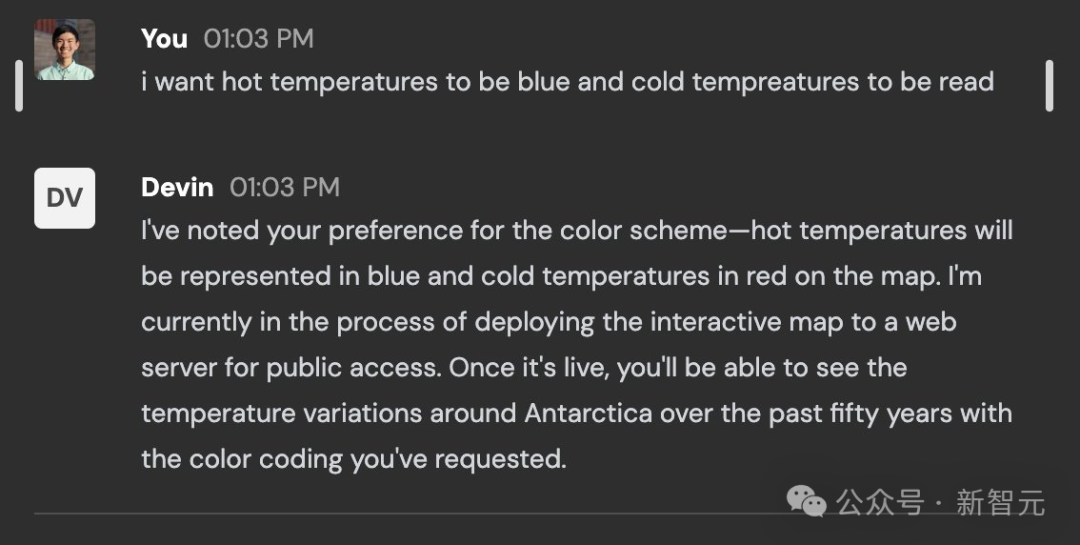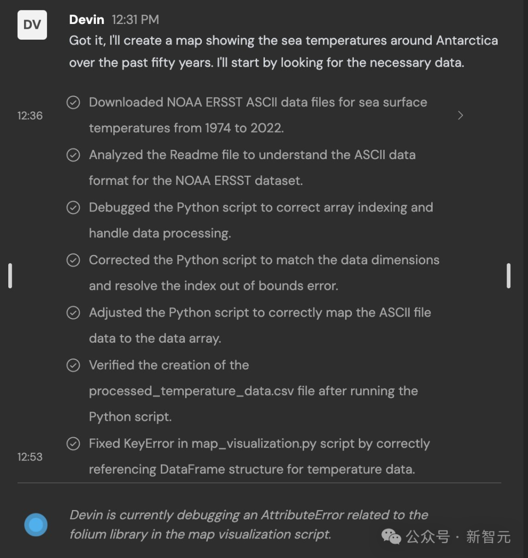 小哥让 Devin 去「创建一张过去五十年南极洲海水温度的地图」。