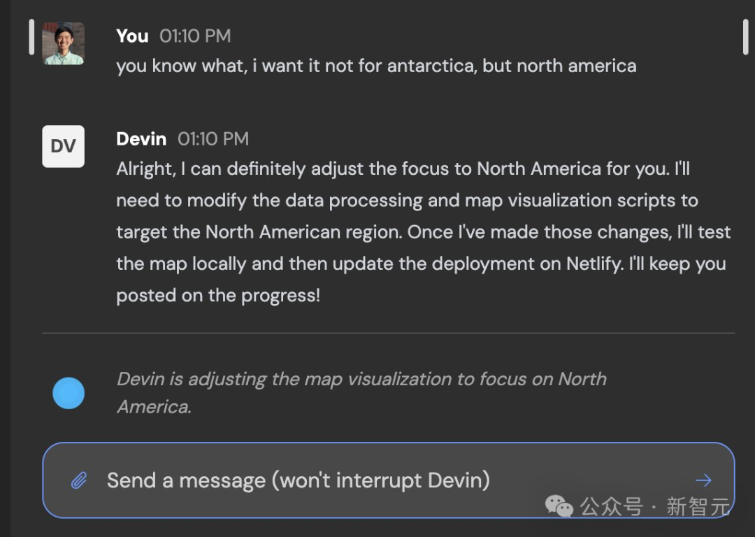 所以他试了试是否可以更改他之前提出的请求或指定其他内容,中断 Devin 的编码过程。