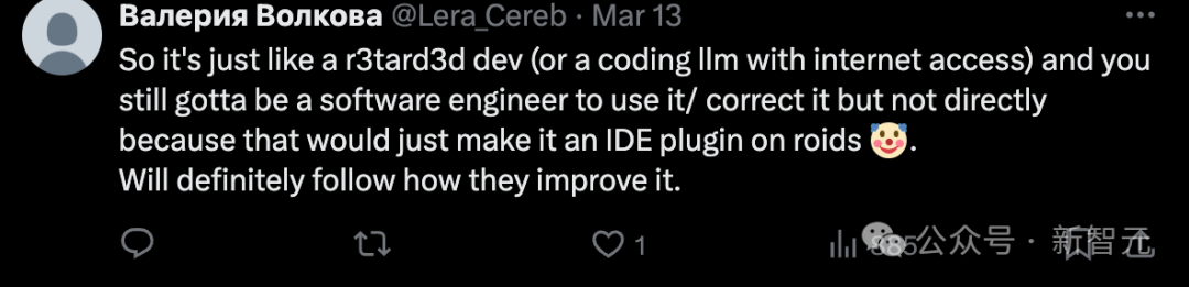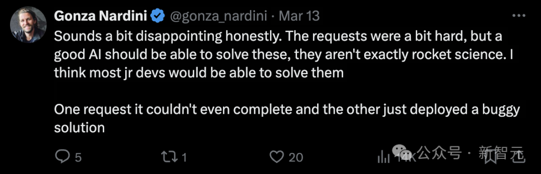 网友看了这个实测之后还是感觉有点失望,毕竟这个任务一个初级程序员是能做到的,但是 Devin 的可视化项目的结果只做出了一个有 Bug 的网页。
