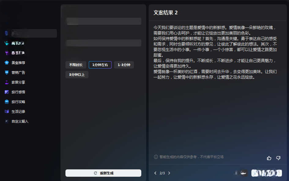 对于创意人士而言,目前剪映也集成了很多有趣的AI功能。像是智能文案功能,只需要输入要求,就可以智能生成口播文案,另外还有智能口播功能,可以将视频当中的停顿、语气词等直接删掉,省去了很多逐字逐句去听音频的时间,并且shownotes也更加容易整理。