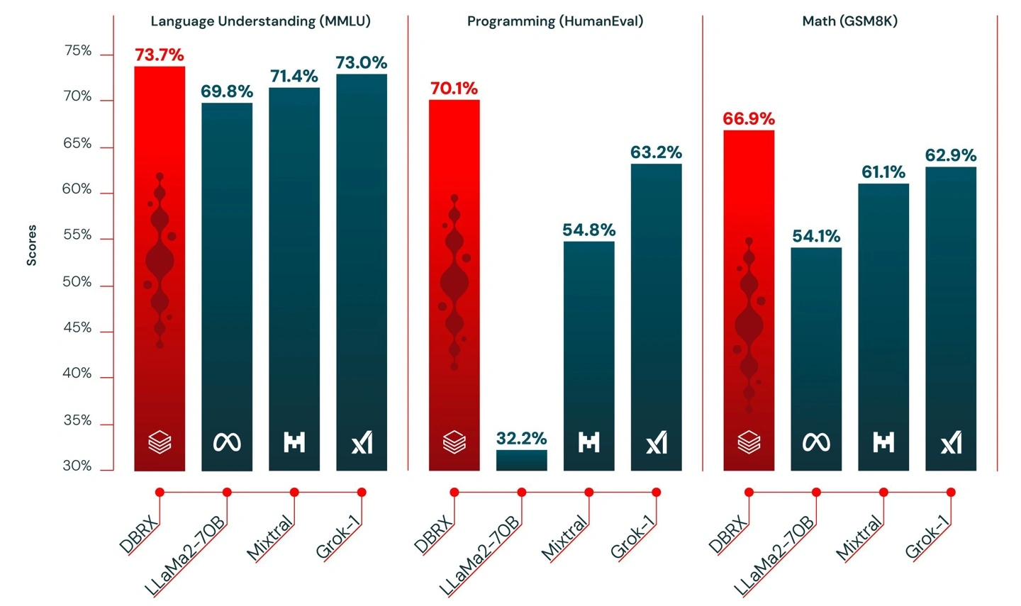 Databricks 在公司博客文章中介绍,在语言理解、编程、数学和逻辑方面,对比 Meta 公司的 Llama 2-70B、法国 MixtralAI 公司的 Mixtral 以及马斯克旗下 xAI 开发的 Grok-1 等主流开源模型,DBRX 均优势胜出。