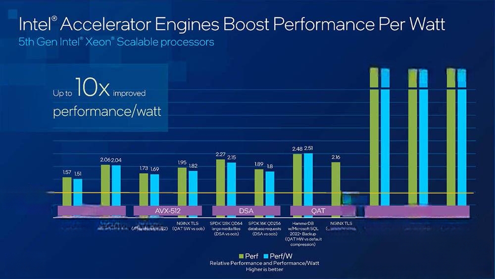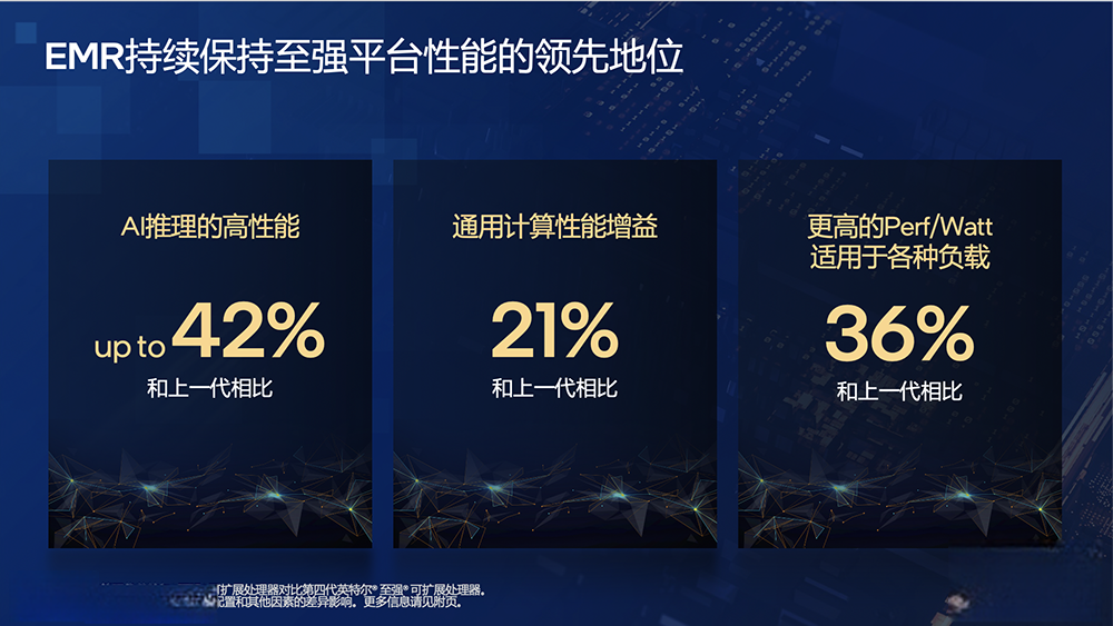 第五代至强引入Raptor Cove核心,核心数从最多60核增至64核;LLC大小从1.875MB增加到5MB,而过去英特尔LLC只有1M-2M;DDR速度从4800MT/s提升到了5600MT/s;UPI速度从16GT/s提升到20GT/s;待机功耗降低;并通过和AI相关的新指令集(如AMX、AVX)来提高主频和性能,有助于加速一些生成式AI应用。