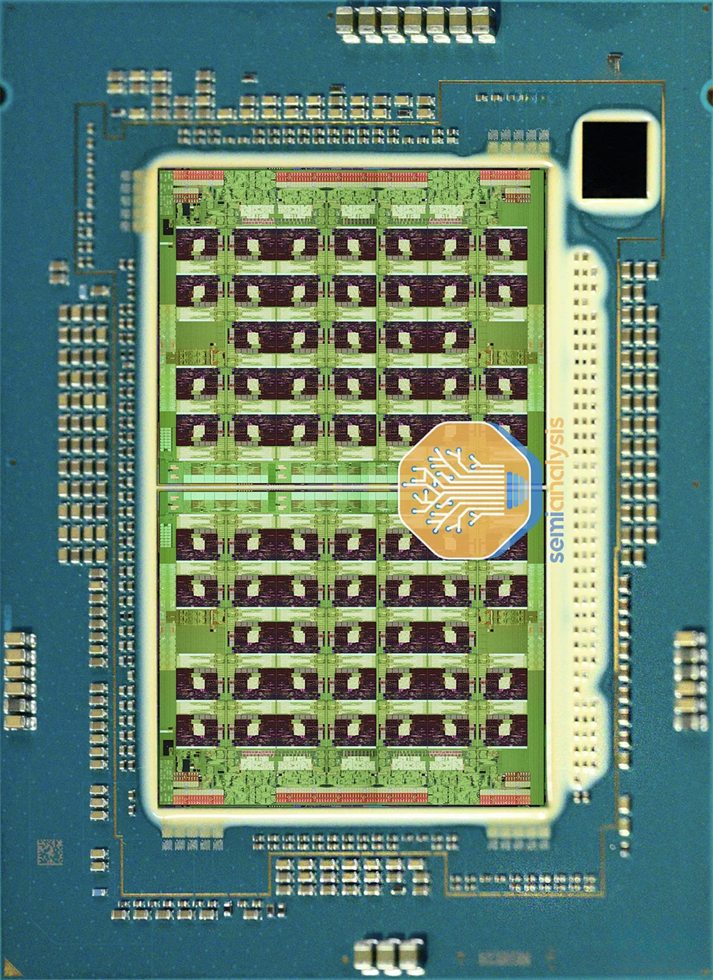 每个芯片内部是一个7×7模块化阵列,CPU核心和缓存在中间,DDR接口和内存控制器在西边和东边,MDF在南边。中间一共有33个硅片,整个芯片有64核,预留了2个冗余核。