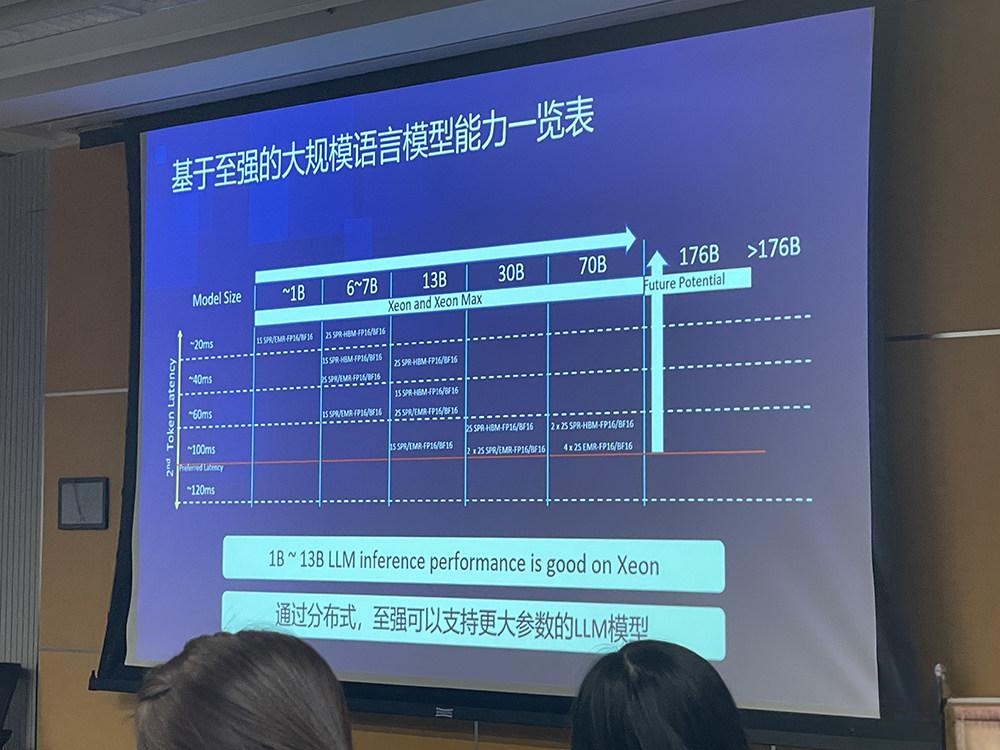 不同大小的模型需要不同的算力支持。如果卡在100ms延迟的标准上,一颗第四代或第五代至强可支持13B参数的模型,两颗可做到30B参数的模型。如果想要更短的延迟,只需把模型缩小。而对于6B或7B参数的模型,一颗第四代英特尔至强可扩展处理器能做到60ms。