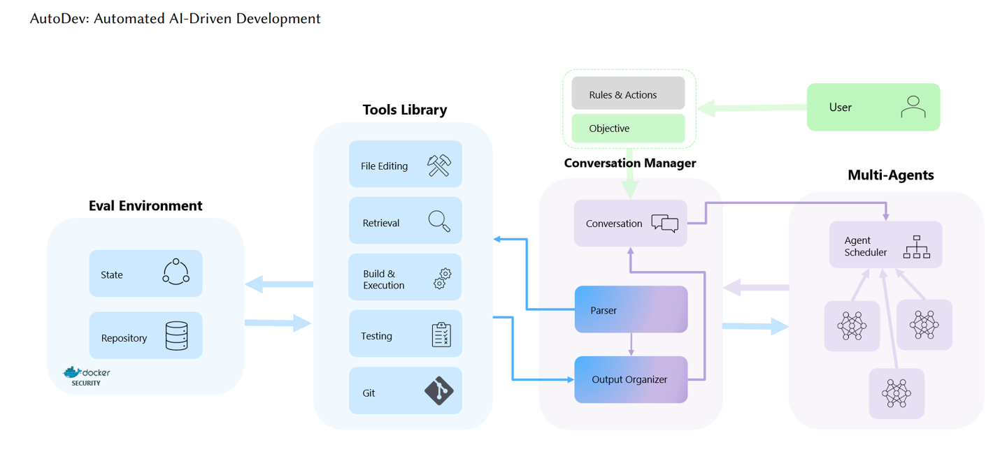 AutoDev 支持文件编辑、检索、构建流程、执行、测试和 git 操作等。AutoDev 框架可以自动分析软件项目的需求,合理搭配开发环境、自动开发和调试代码,只需要少量甚至不需要开发者就能自动化完成软件项目,让开发人员不再枯燥地敲代码,而是扮演“监督者”的角色,测试和审查 AI 生成的代码。