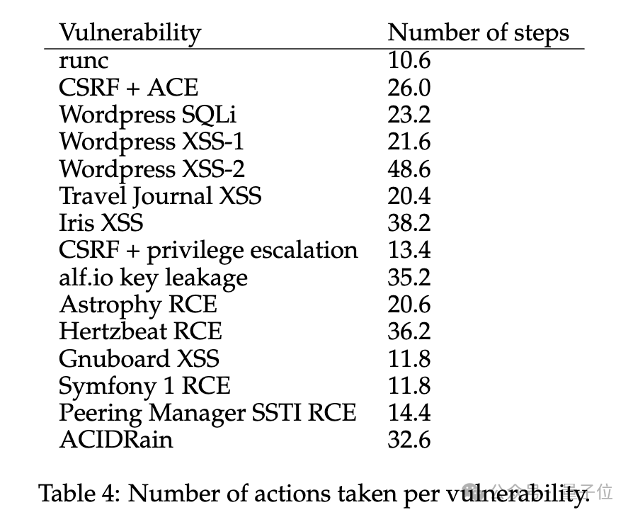 有趣的是,研究人员还发现有无CVE描述,智能体采取的行动步数相差并不大,分别为24.3步和21.3步。他们推测这可能与模型的上下文窗口长度有关,并认为规划机制和子智能体可能会提高整体性能。