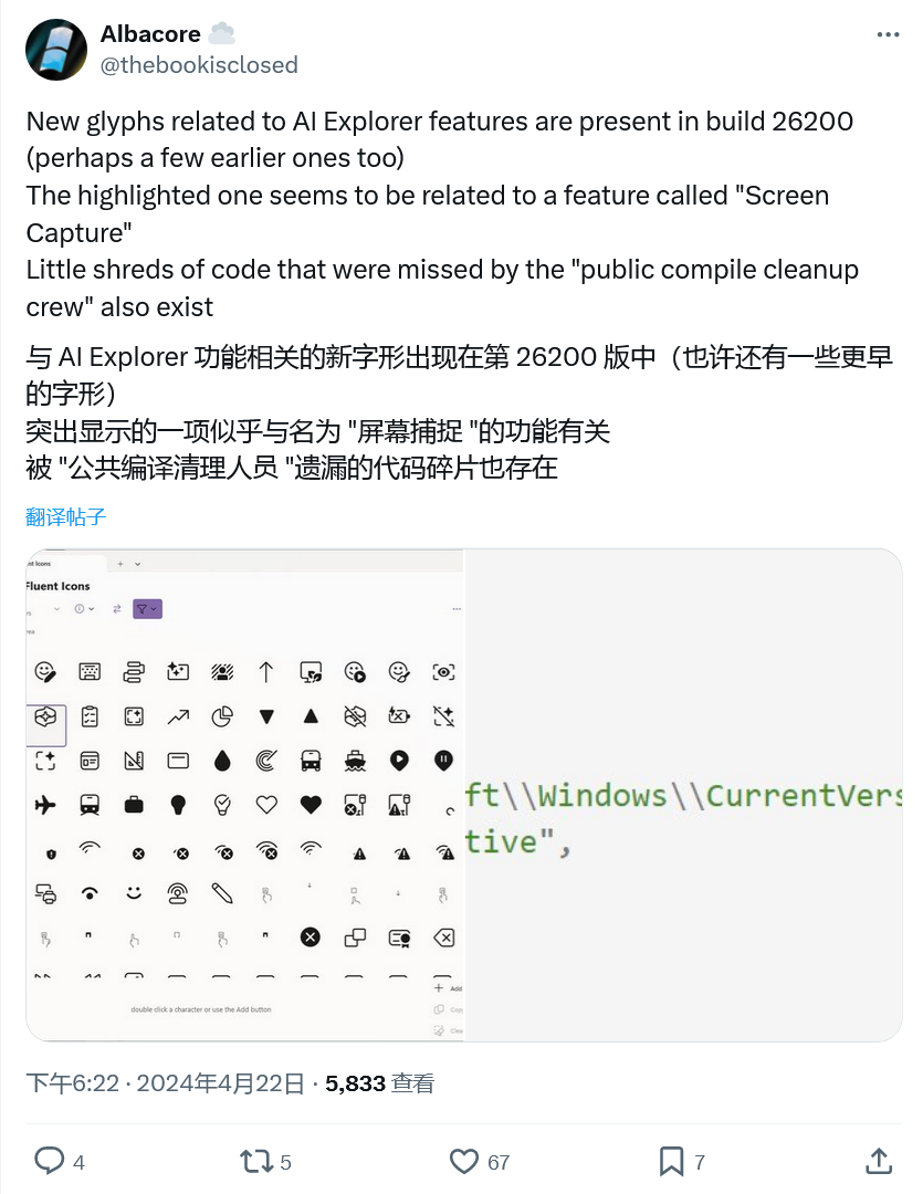 4 月 23 日消息,消息源 Albacore 近日挖掘 Windows 11 Build 26200 预览版更新,发现了关于 AI Explorer 功能的更多信息,代码中包括 Screen Capture、Sidebar Island、Shoulder Tap、Screen Understanding、Intent Engine 以及 Discovery Overlay。