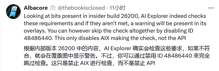 另外值得注意的是,Windows 11 Build 26200 预览版进一步强调了 AI Explorer 的配置要求:
