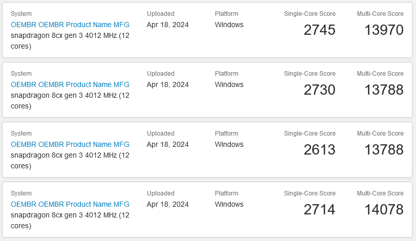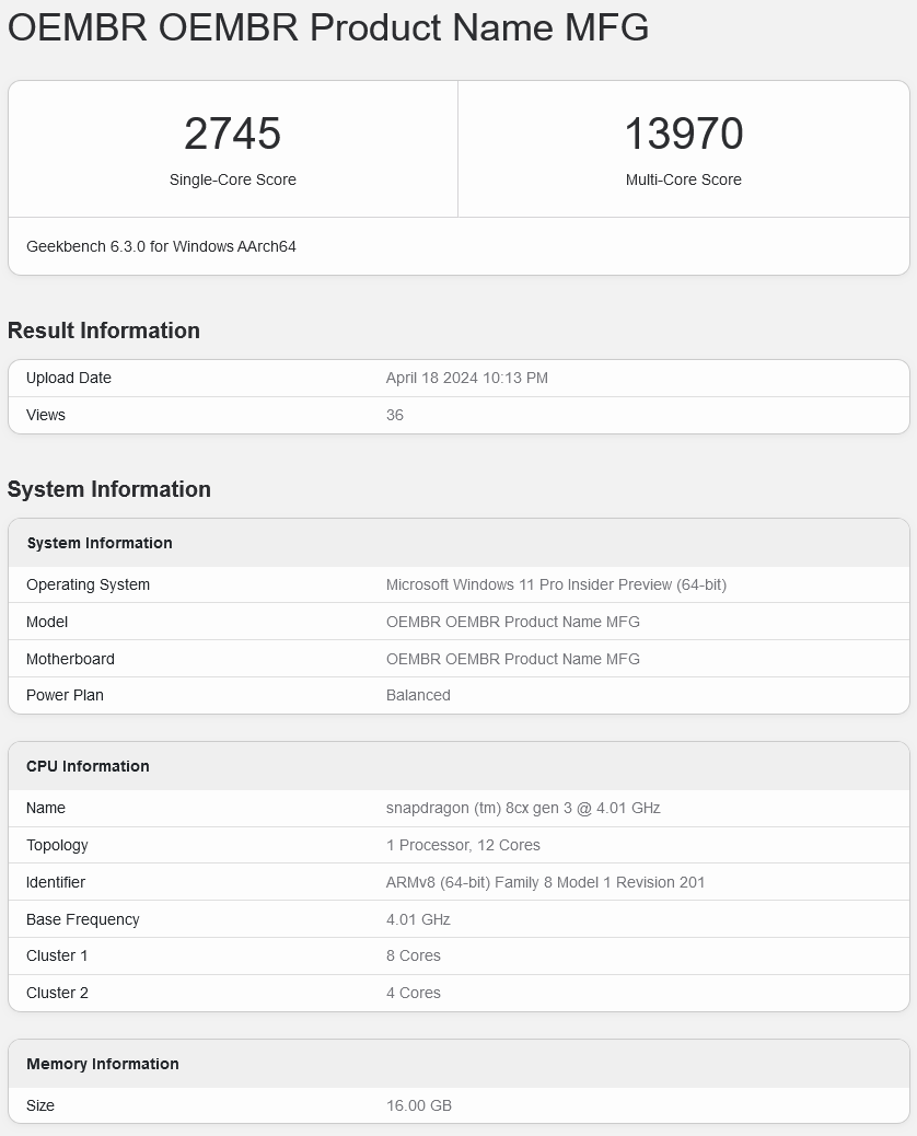 OEMMN OEMMN 现身 GeekBench 跑分库,应该就是搭载高通骁龙 X Plus 芯片的 Surface Pro 10。