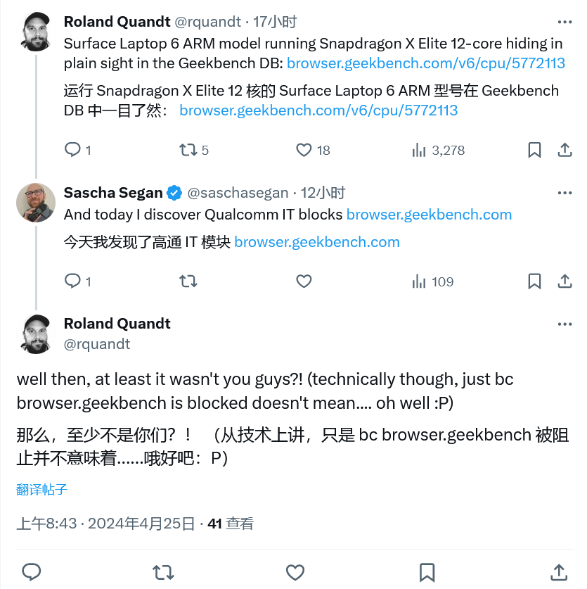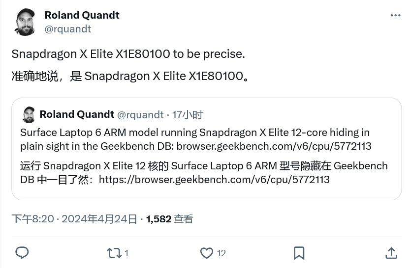 4 月 25 日消息,消息源 Roland Quandt 近日发布推文,表示在 GeekBench 跑分库上发现了面向消费者的 Surface Laptop 6 笔记本,配备高通骁龙 X Elite 处理器(X1E80100)。