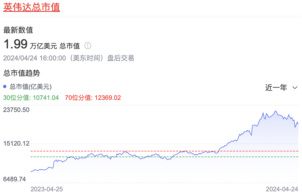 目前英伟达市值徘徊在 2 万亿美元左右,估值短短 9 个月从 1 万亿美元增加到超过 2 万亿美元,跻身全球市值前三。