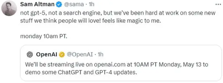值得一提的是,Sam Altman 在 X 平台转发了上述消息,并确认下周一不会发布 GPT-5,也不会发布 AI 搜索引擎。他还表示:“我们一直在努力开发一些我们认为人们会喜欢的新东西,对我来说感觉就像魔法一样。”