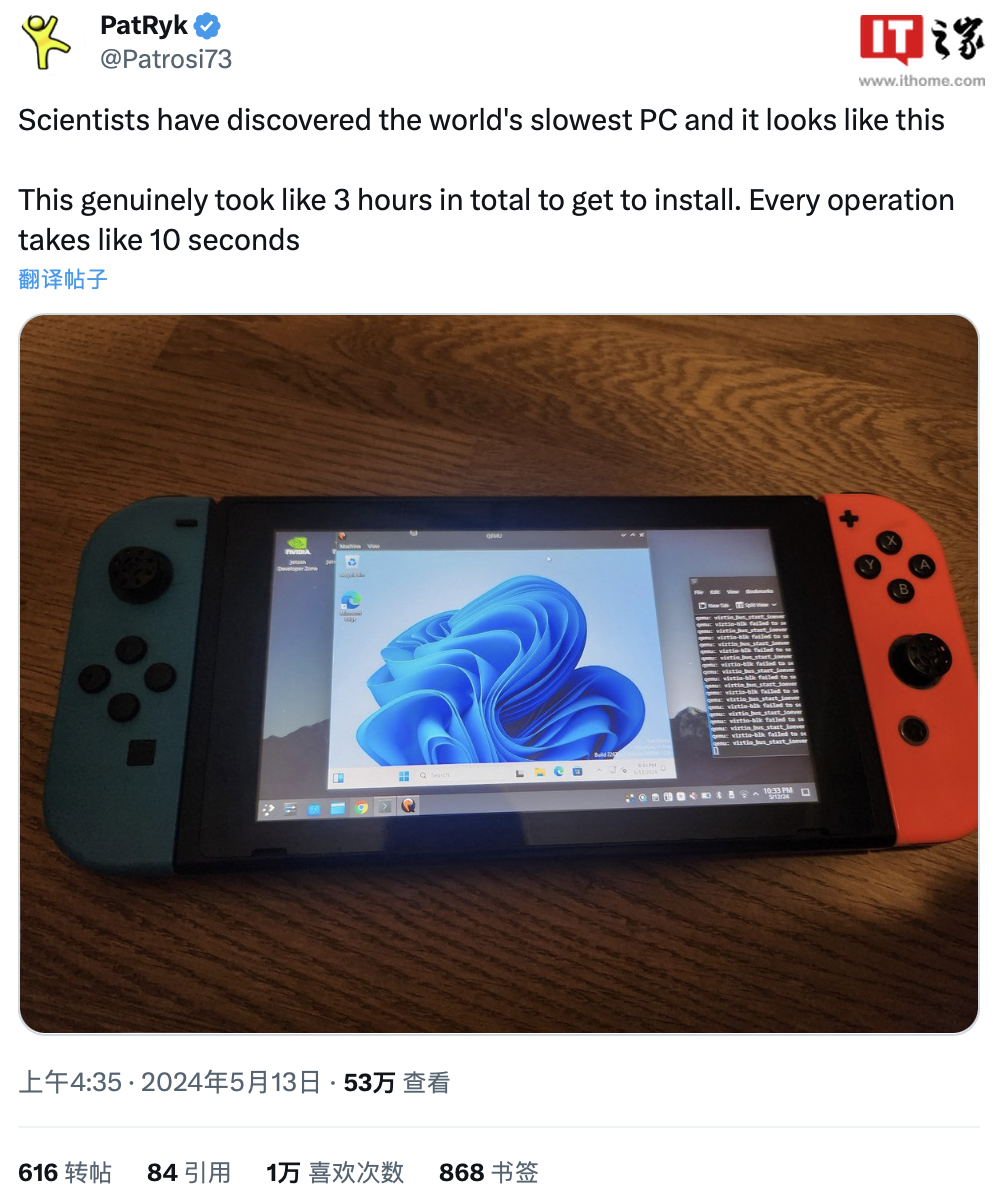5 月 14 日消息,一名开发者“PatRyk”近日在 X 平台发帖,展示了任天堂 Switch 初代游戏机在 Linux 环境下通过 QEMU 模拟运行 Windows 11 ARM 的效果,由于 Switch 游戏机硬件及驱动问题,黑客声称目前该机无法游玩游戏,甚至系统响应“都需要 10 秒钟”。